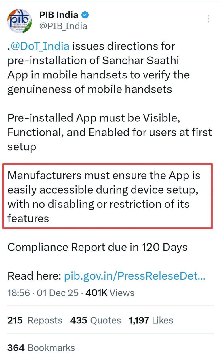 لیکن جب سندھیا نے کہا کہ ایپ اختیاری ہوگا، سوموار کو جاری پی آئی بی کی ریلیز نے 28.11.2025 کو محکمہ ٹیلی کمیونی کیشن کی طرف سے جاری کردہ ہدایات کا حوالہ دیتے ہوئے کہا کہ ہندوستان میں استعمال ہونے والے موبائل ہینڈ سیٹ بنانے اور درآمد کرنے والی کمپنیوں کے لیے ایپ کو پری-انسٹال رکھنا اور اسے غیر فعال ہونے کی اجازت نہیں دینا لازمی ہے۔