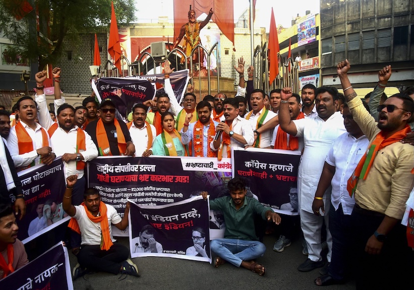 ای ڈی کے نیشنل ہیرالڈ کیس کا حوالہ دیتے ہوئے بی جے پی کارکن اپریل 2025 میں کانگریس پارٹی کے خلاف احتجاج کرتے ہوئے۔ (تصویر: پی ٹی آئی)