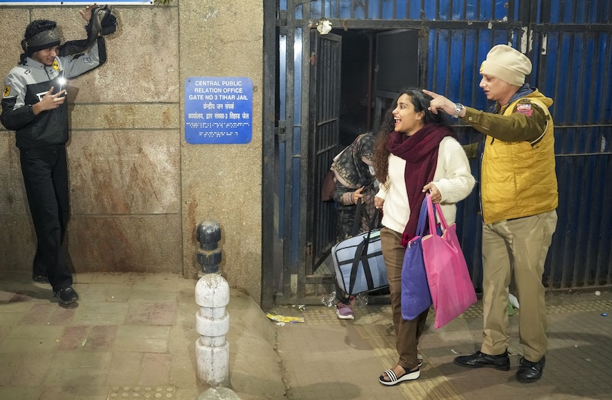 دہلی کی تہاڑ جیل سے رہا ہوکر باہر آتیں سماجی کارکن گلفشاں فاطمہ، جنہیں فروری 2020 کے دہلی فسادات سے متعلق مبینہ ‘بڑی سازش’ کیس میں یو اے پی اےکے تحت پانچ سال سے زیادہ عرصے سے جیل میں رکھا گیا تھا ۔ (تصویر: پی ٹی آئی)