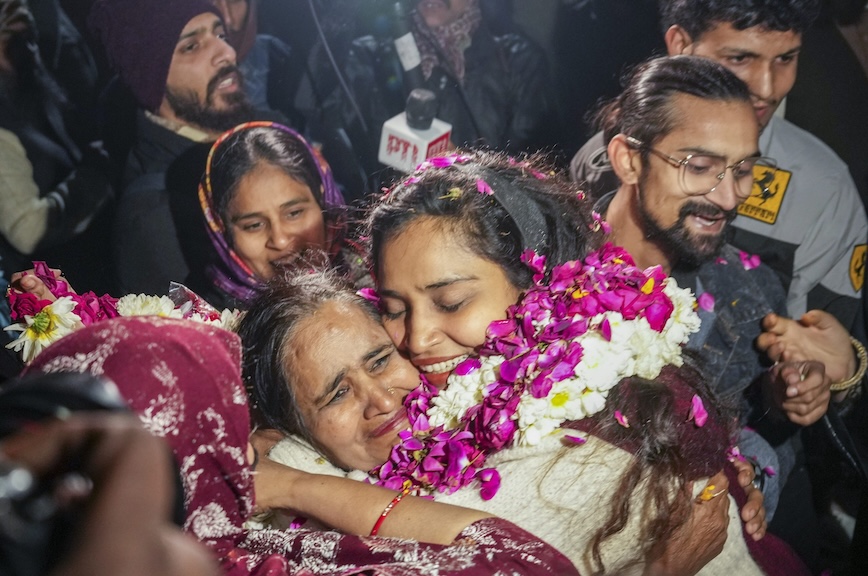 سماجی کارکن گلفشاں فاطمہ تہاڑ جیل سے رہا ہونے کے بعد اپنی والدہ سے گلے ملتی ہوئیں۔ (تصویر: پی ٹی آئی)