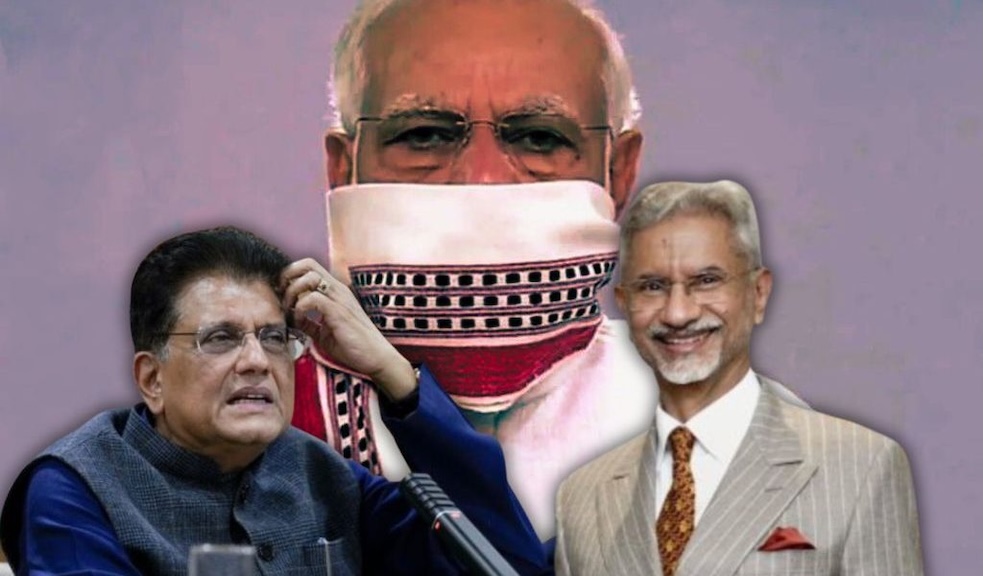 پیوش گوئل اور ایس جئے شنکر۔ پس منظر میں وزیر اعظم نریندر مودی کی ایک فائل فوٹو۔ (تصویر: پی ٹی آئی)