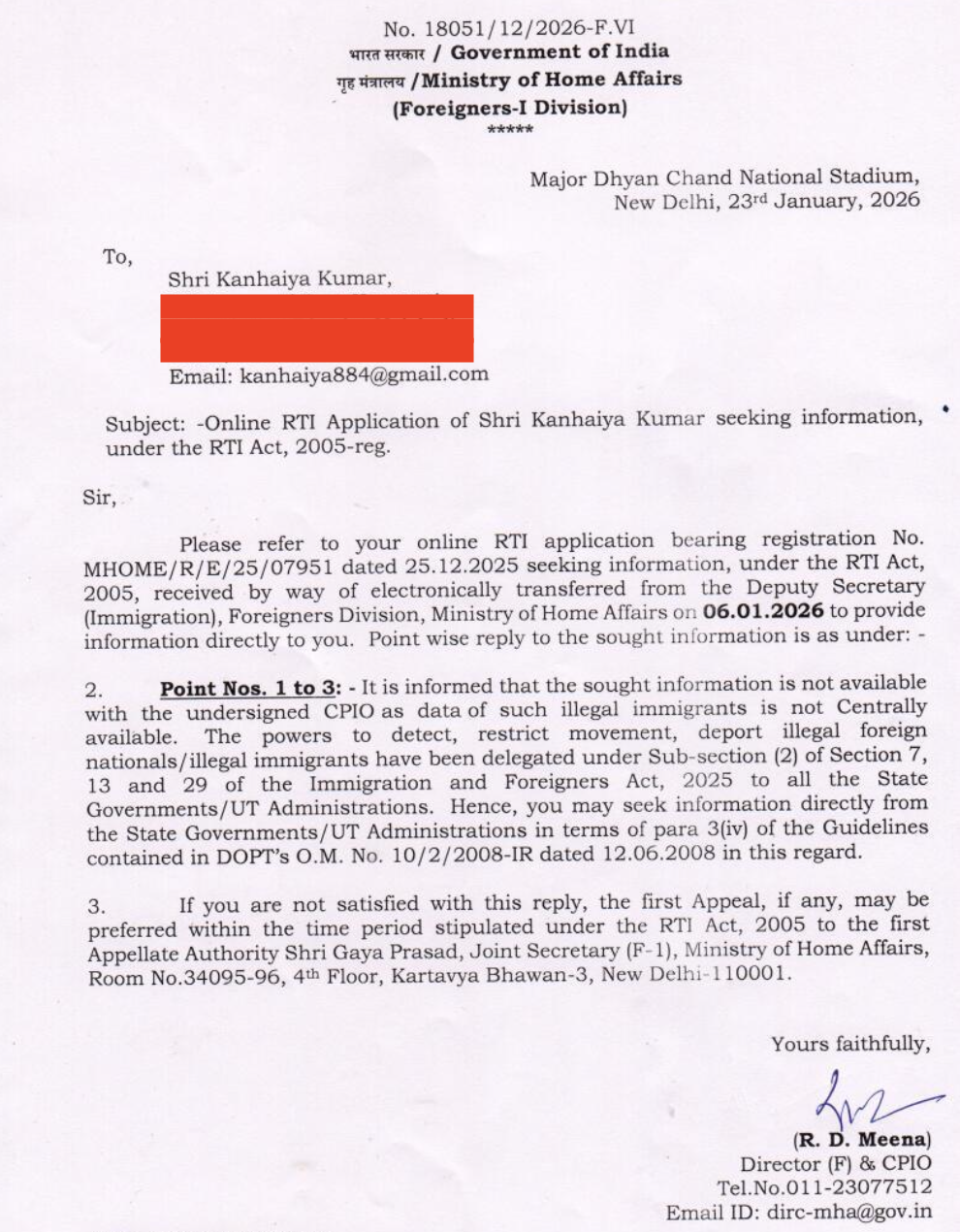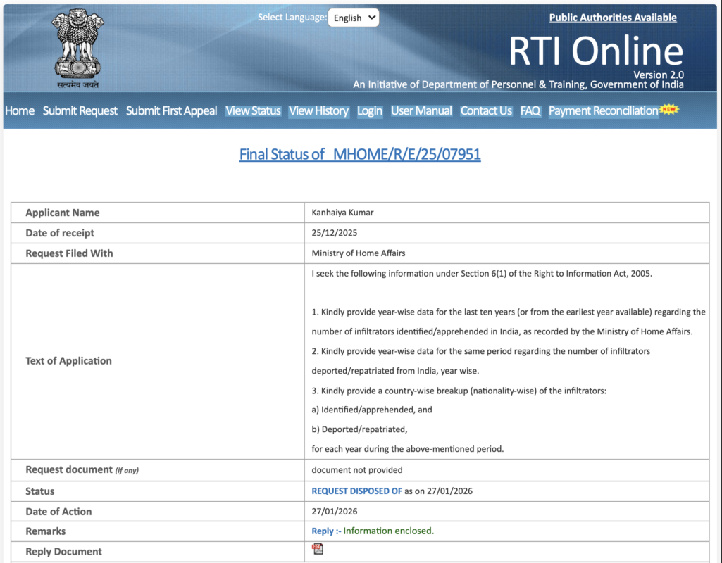 گزشتہ23جنوری 2026 کو دیے گئے اپنے جواب میں وزارت داخلہ نے واضح کیا کہ اس کے پاس ملک میں دراندازوں کی شناخت، گرفتاری یا ملک بدری سے متعلق کوئی ڈیٹا مرکزی سطح پر دستیاب نہیں ہے۔