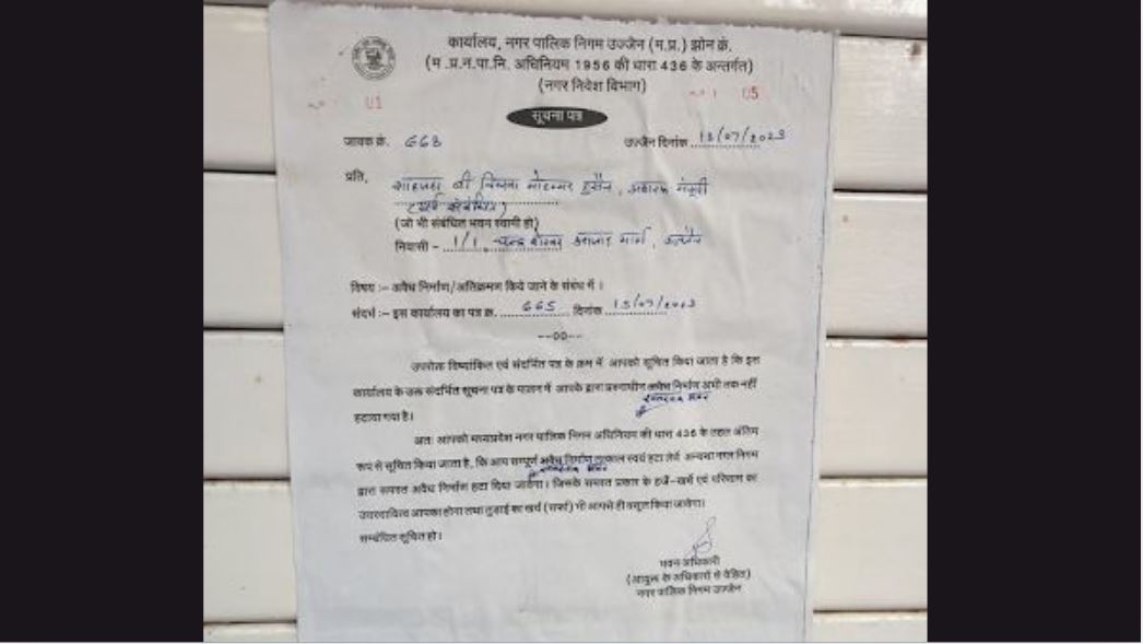 مدھیہ پردیش کے شہر اجین میں 15 جولائی 2023 کی تاریخ کا ایک نوٹس 19 جولائی کو منصوری بلڈنگ پر چسپاں کیا گیا تھا—یہ عمارت ایک مسلم نوجوان کے والد کی تھی، جس پر ہندو جلوس پر تھوکنے کا غلط الزام لگایا گیا تھا—اور نوٹس میں ’غیر قانونی تعمیر‘ کی جگہ ’ خطرناک عمارت‘ لکھ دیا گیا تھا۔ اگر عمارت ’غیر قانونی ‘ تھی، تو بلدیاتی قوانین کے مطابق 14 دن کا نوٹس دینا لازمی تھا۔ یہ نہیں بتایا گیا کہ عمارت ’ خطرناک‘کیوں تھی۔ دو گھنٹے بعد، عمارت ملبے کے ڈھیر میں تبدیل ہو گئی۔