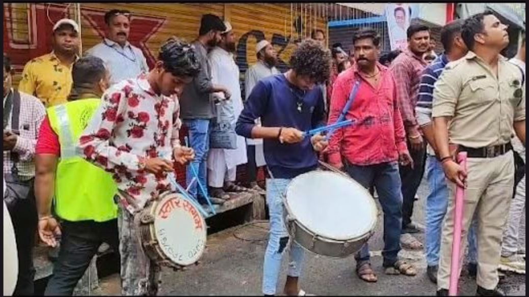 اجین میں ایک مسلم مالک کی عمارت گرائے جانےسے پہلے ڈھول بجایا جا رہا تھا اور ایک ساؤنڈ ٹرک پر ہندو بھکتی گیت چل رہے تھے، جہاں تین مسلم نوجوانوں پر ایک ہندو جلوس پر تھوکنے کا جھوٹا الزام لگایا گیا تھا۔(فوٹو: اسپیشل ارینجمنٹ)