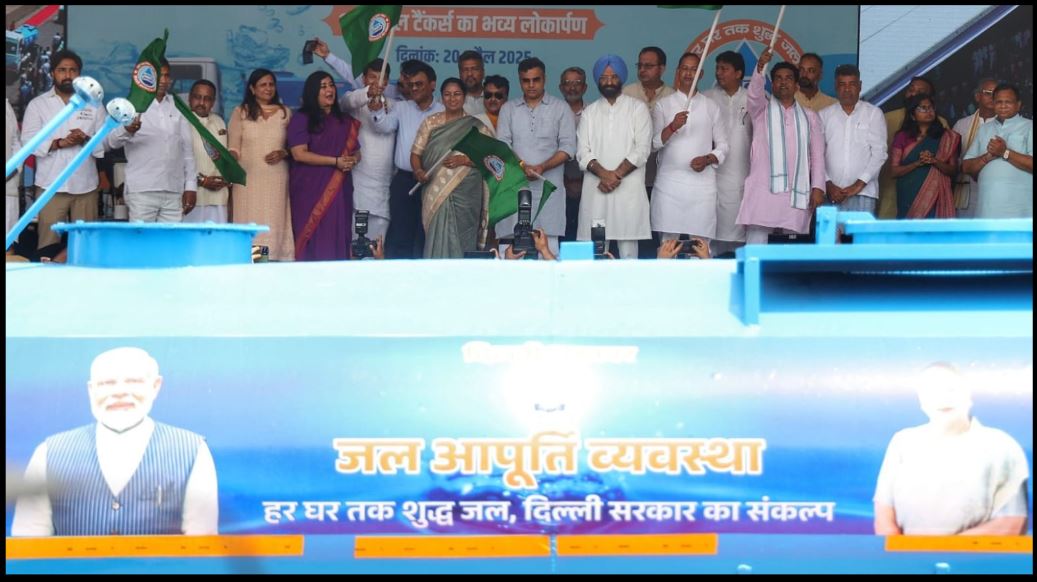 پانی کے ٹینکر کو ہری جھنڈی دکھاتیں وزیر اعلیٰ ریکھا گپتا۔ تصویر بہ شکریہ: بی جے پی