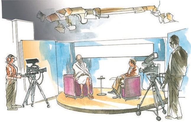 چرب زبان ٹی وی اینکراور اسٹوڈیو کی آنکھوں کو چندھیا دینے والی روشنی فادر آف نیشن کو چت کرنے کی کوشش میں اوندھے منہ گر گئے ۔ اس گاندھی جینتی پر،خود مہاتماگاندھی کو ایک خصوصی انٹرویو کے لئے ٹی وی اسٹو ڈیو میں آنے کے لیےرا ضی کیا گیا۔ ان سے کی گئی اس خاص بات چیت کے چند اقتباسات ملاحظہ کریں: